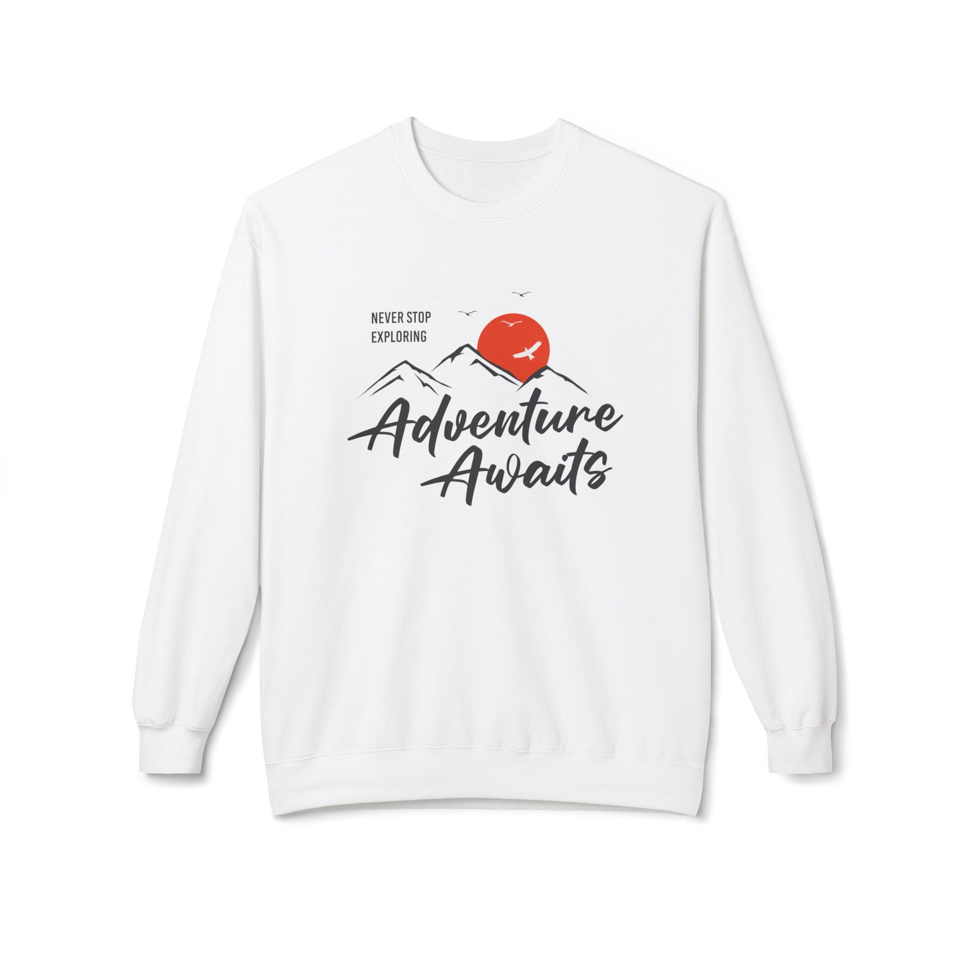 Crisp, cozy, and quietly adventurous — this crewneck wraps you in a medium-heavy cotton blend that feels lived-in from the first wear. A soft, relaxed silhouette with dropped shoulders and ribbed cuffs sits easily over hiking layers or a favorite tee. The front graphic — a sun dipping behind a simple ridge with the words “Adventure Awaits” — nudges you to step outside, whether you’re packing a daypack for a trail or sipping coffee on a foggy morning porch. It’s made with thoughtful construction (tubular knit with no side seams, tear-away label) so the fit stays clean and comfortable, wash after wash. Reach-certified and responsibly produced, this sweatshirt is for people who collect mornings on the trail, weekend road trips, and quiet moments at basecamp.