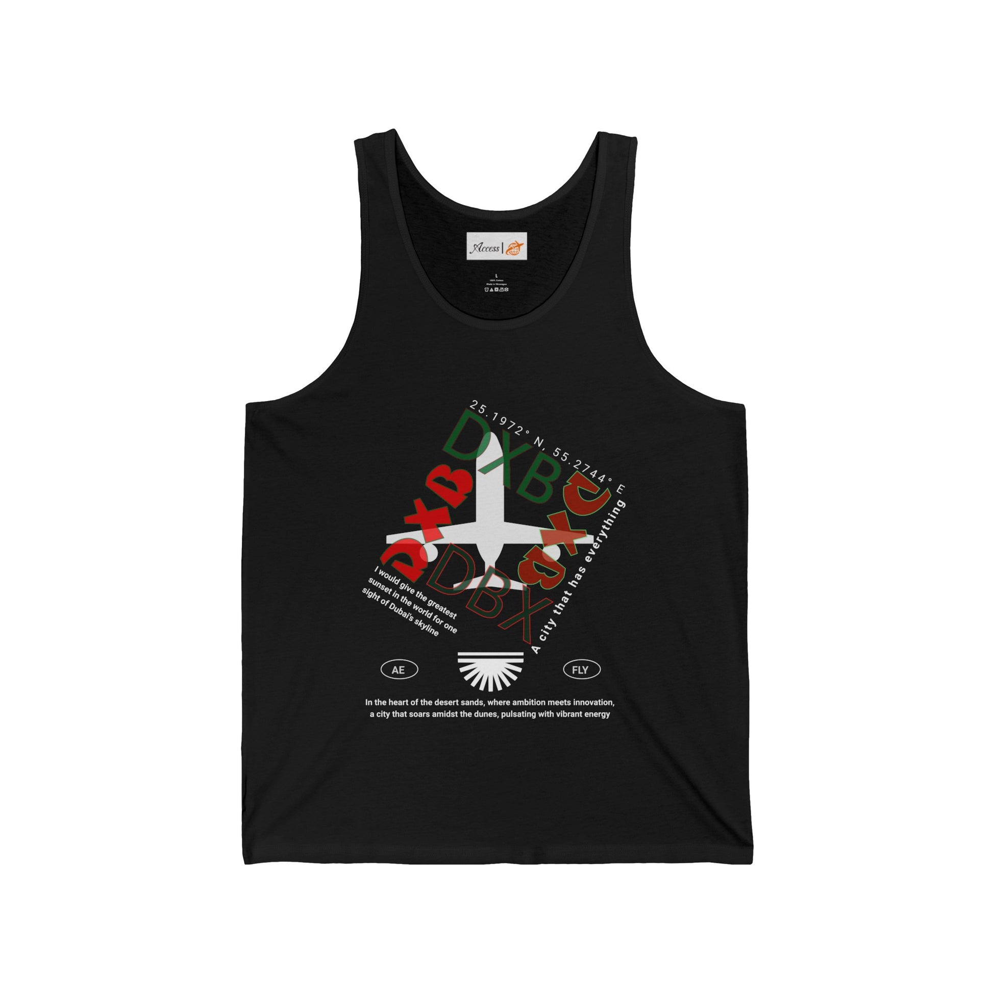 Embark on your next adventure with our exclusive "Flying over DXB" unisex jersey tank top! Crafted for comfort and style, this must-have piece features a high-quality print that makes it an enduring statement shirt. Designed with side seams for structural support and bindings from the same fabric, it's a perfect blend of durability and luxury. Available in a range of colors, each tank boasts a unique combination of cotton, polyester, or rayon, ensuring versatility for any adventure. Made from 100% Airlume combed and ring-spun cotton, our extra-light fabric guarantees a retail fit that stays true to size. Step into your next journey with confidence and make this tank your trusted travel companion. Explore our collection today!